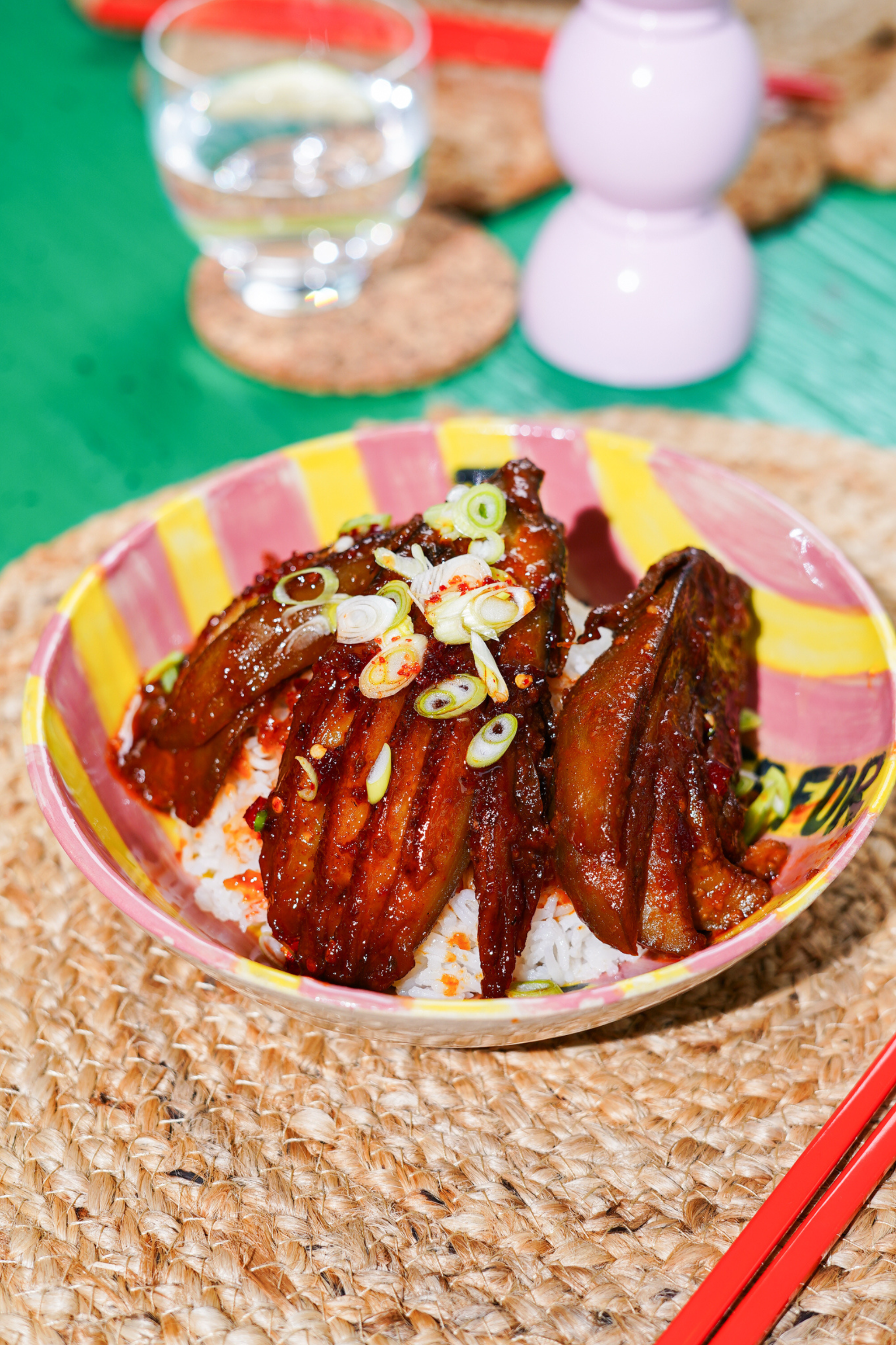 Enfin, je dispose joliment l'aubergine sur ou à côté du riz et je termine avec du miel de piment et des jeunes oignons finement hachés.