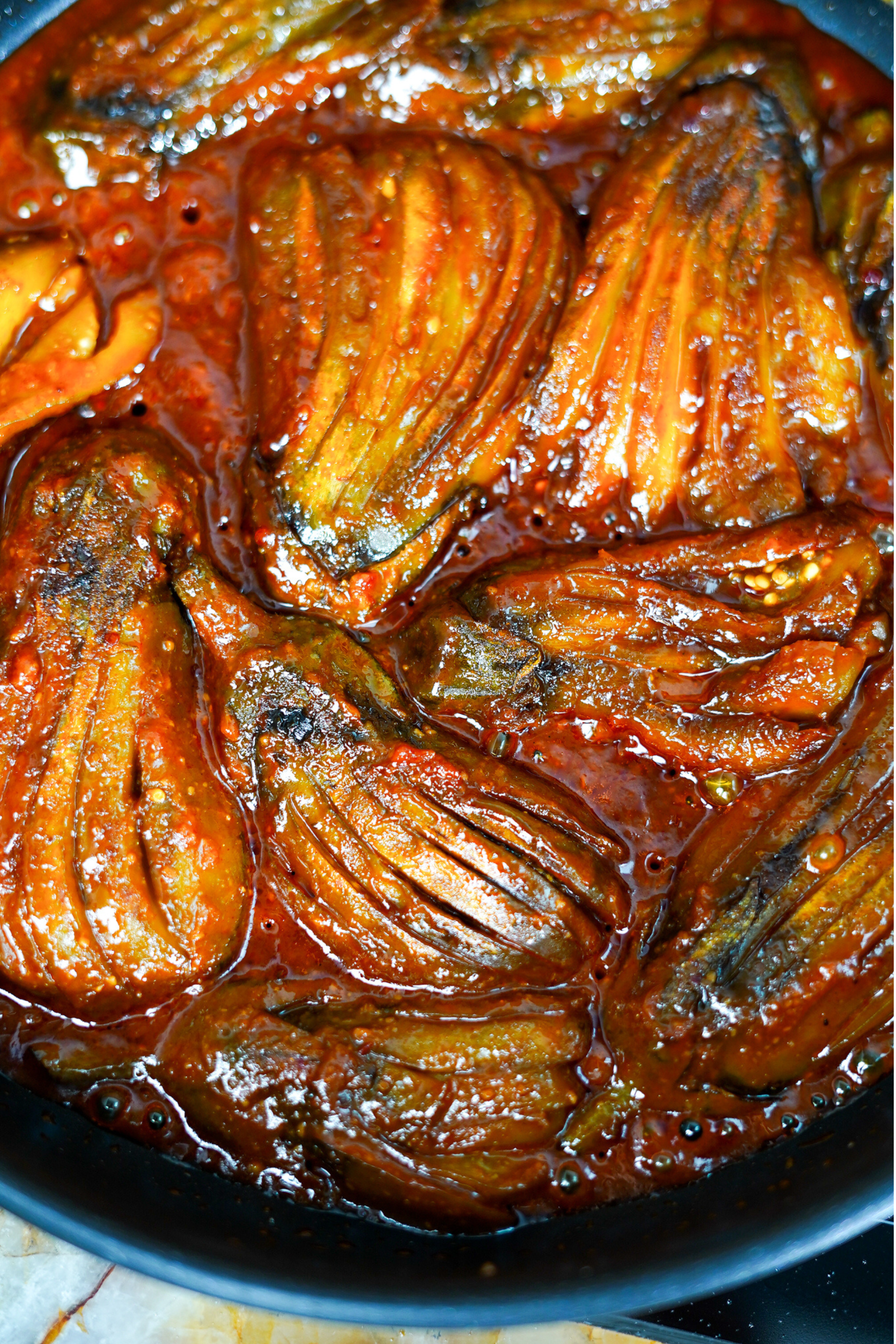 Une fois l'aubergine tendre, je verse le glaçage dessus. Je la laisse caraméliser et je la retourne pour que les deux côtés soient bien dorés et collants.