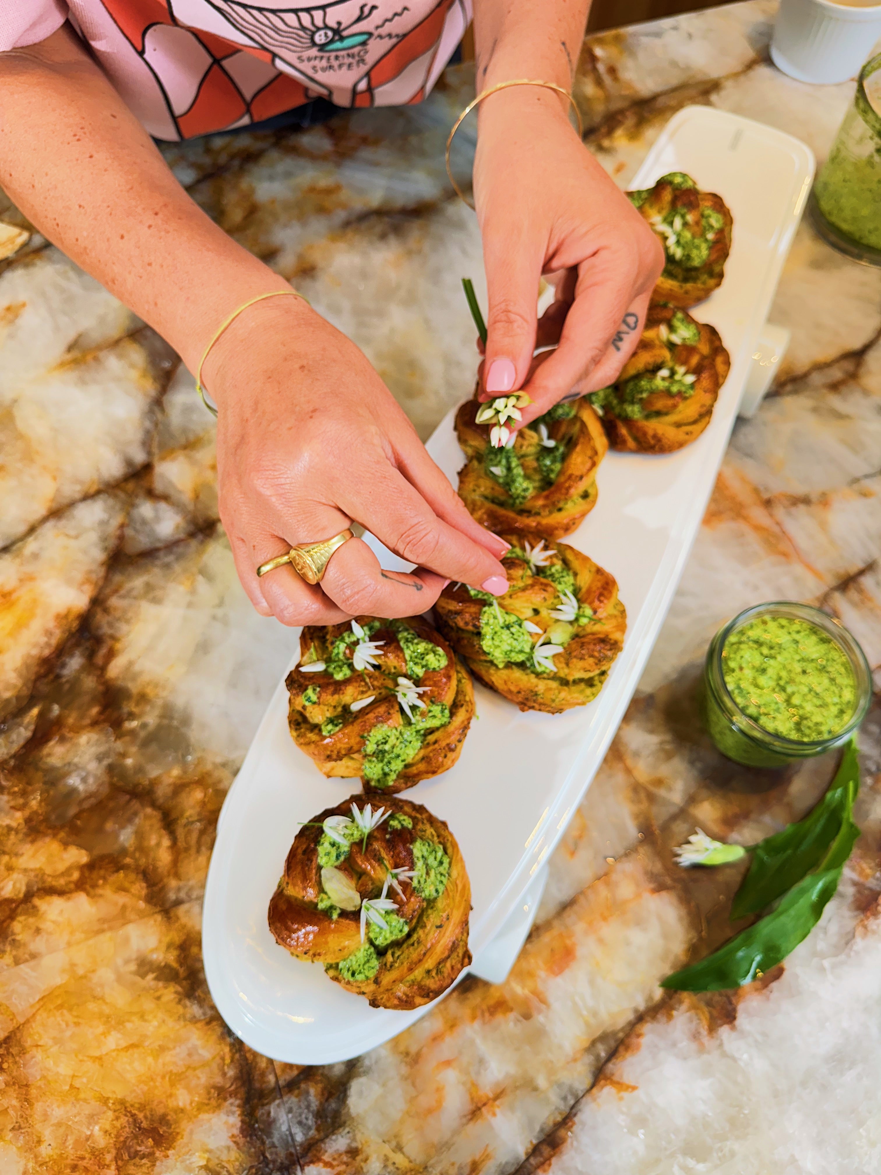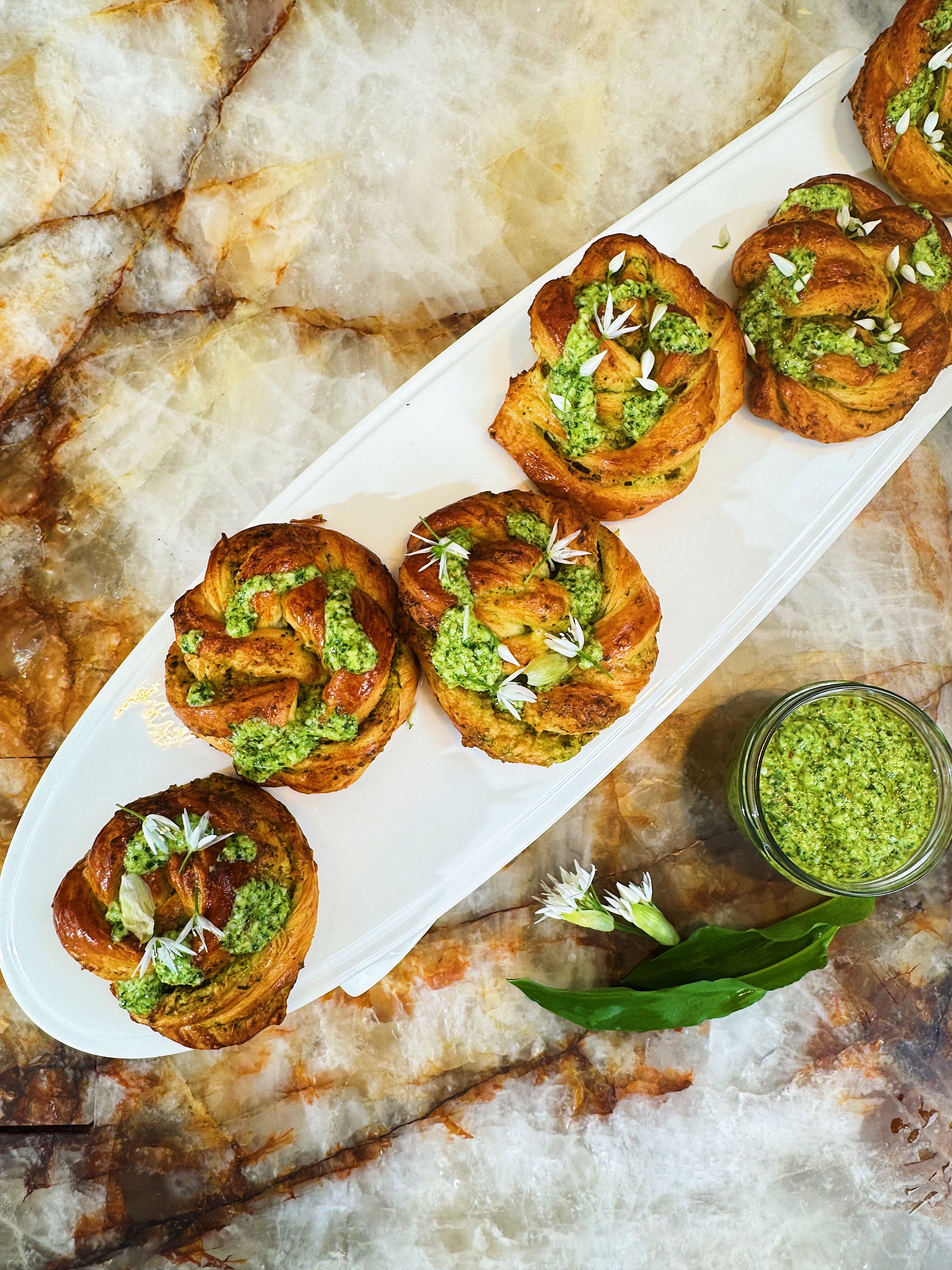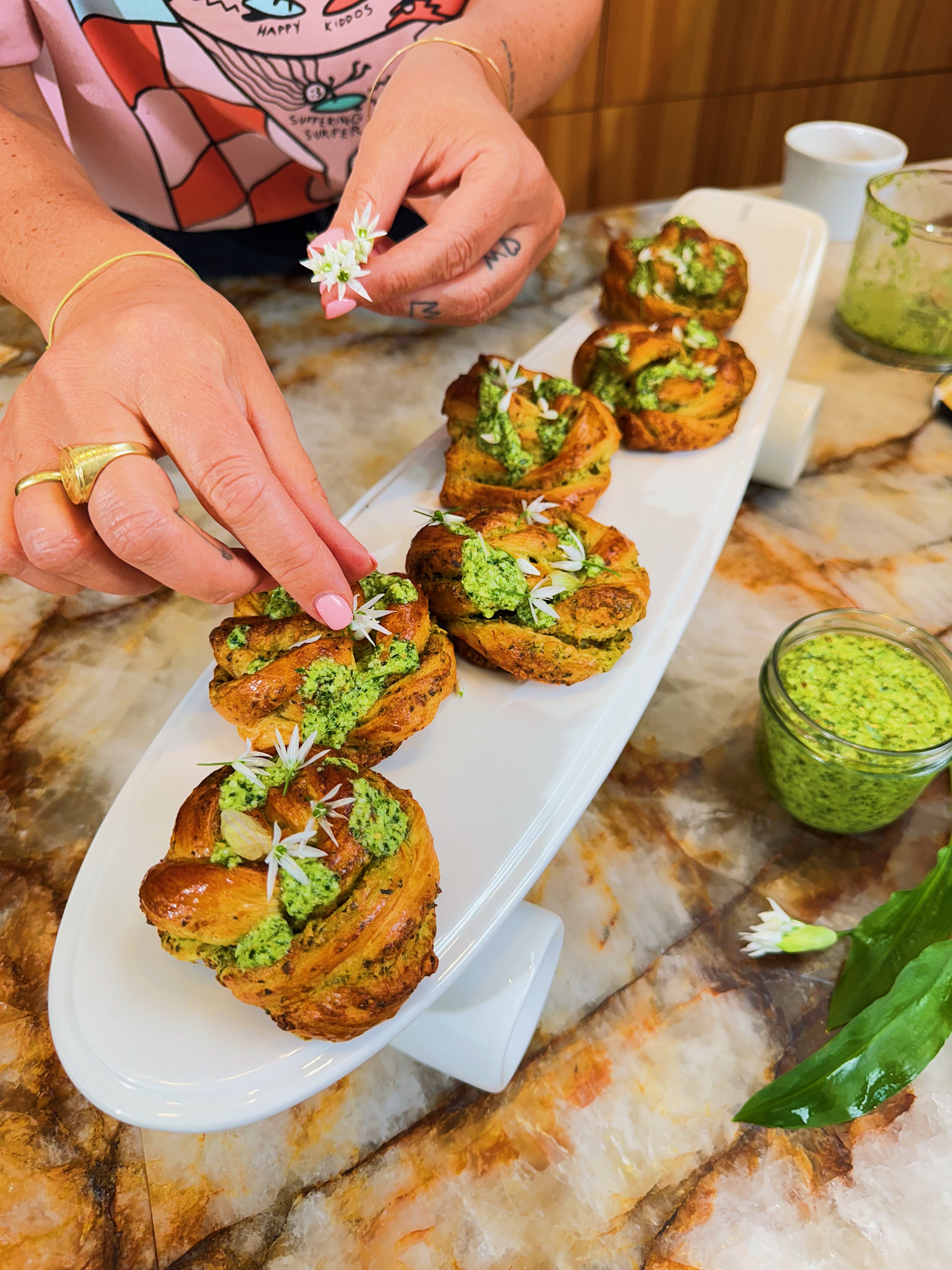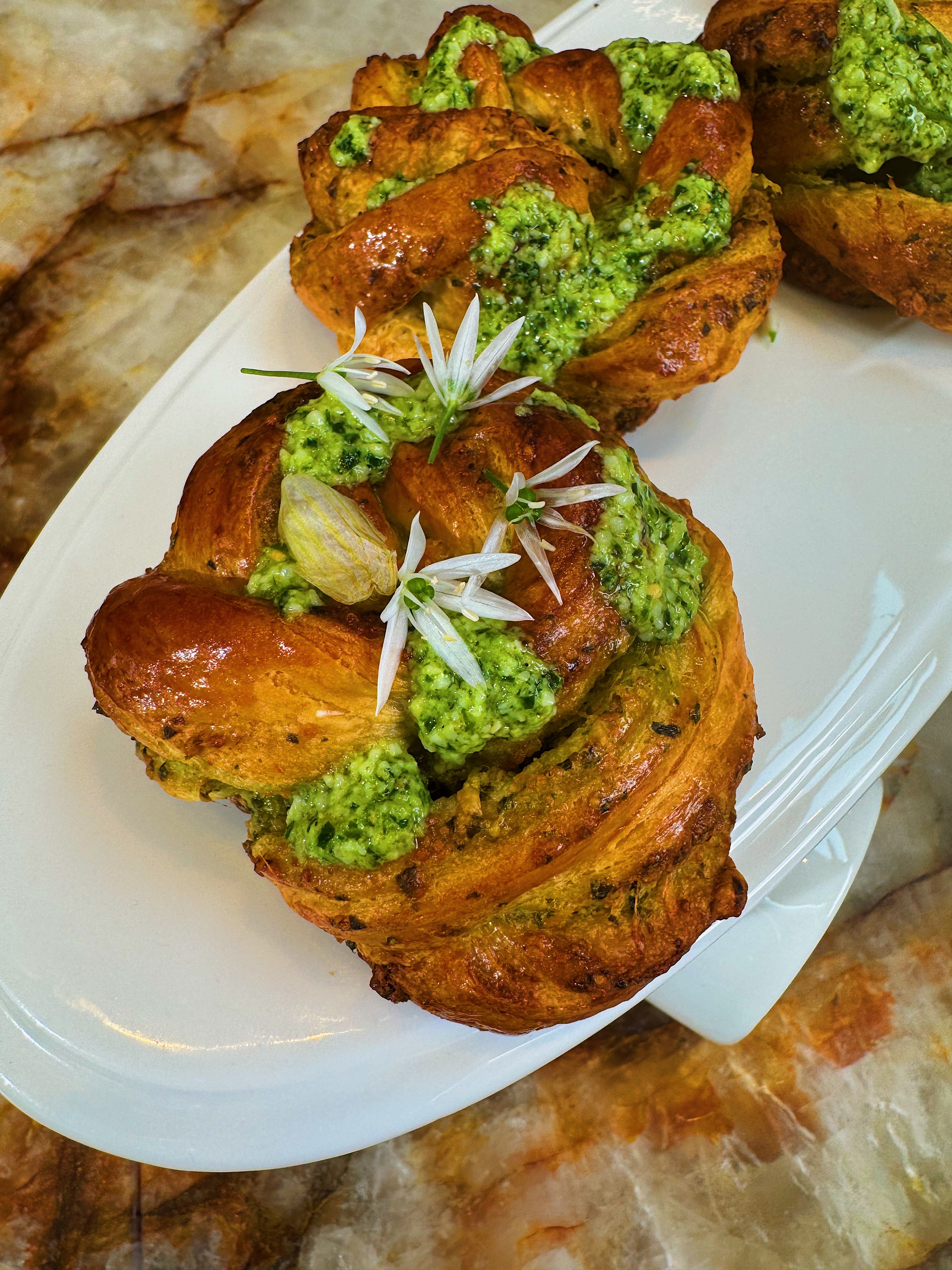 6. ServirServir chaud, avec un peu de pesto d'ail des ours supplémentaire et quelques fleurs d'ail des ours pour la touche finale.
