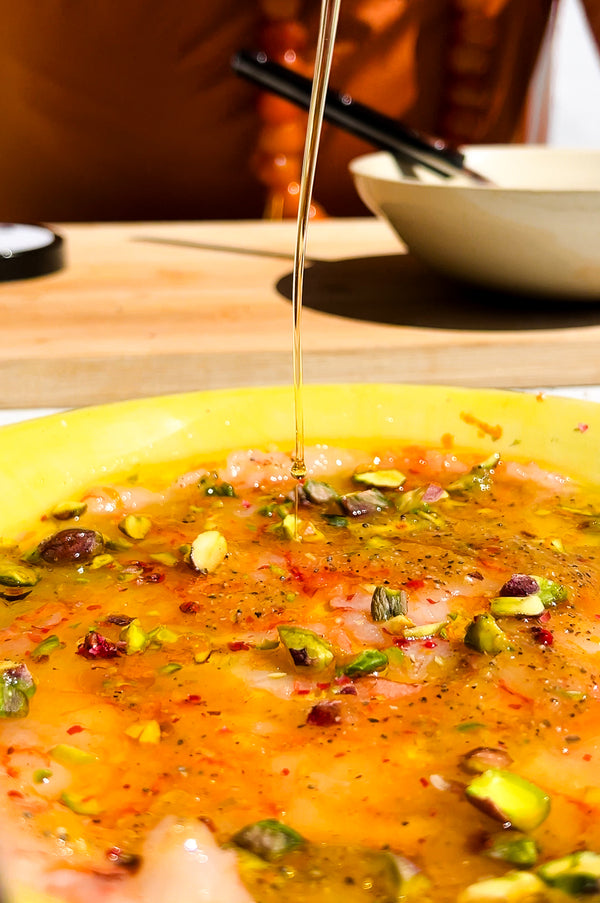 Carpaccio de grosses crevettes rouges avec vinaigrette à l'orange, pistaches et câpres croustillantes