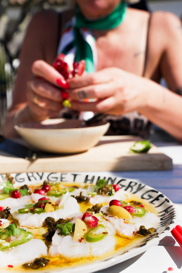 Finir et servir: Sortez le poisson du réfrigérateur et répartissez sur chaque tranche quelques câpres, morceaux d'olive, graines de grenade, une rondelle de chili et une feuille de coriandre. Versez généreusement la marinade sur le poisson.