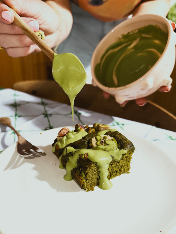 Pain à la banane au matcha (sans gluten, sans sucre raffiné) avec teff et pistache