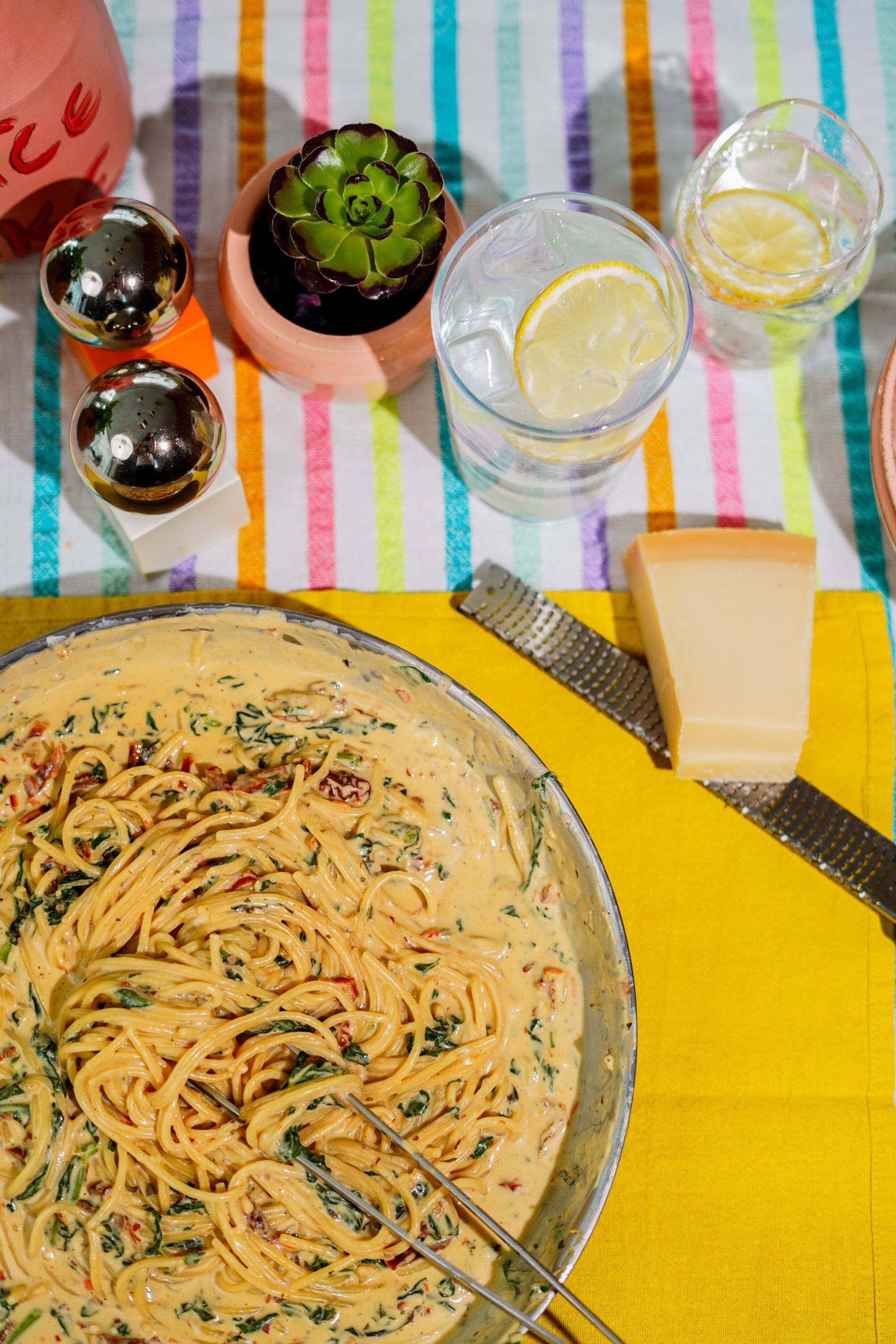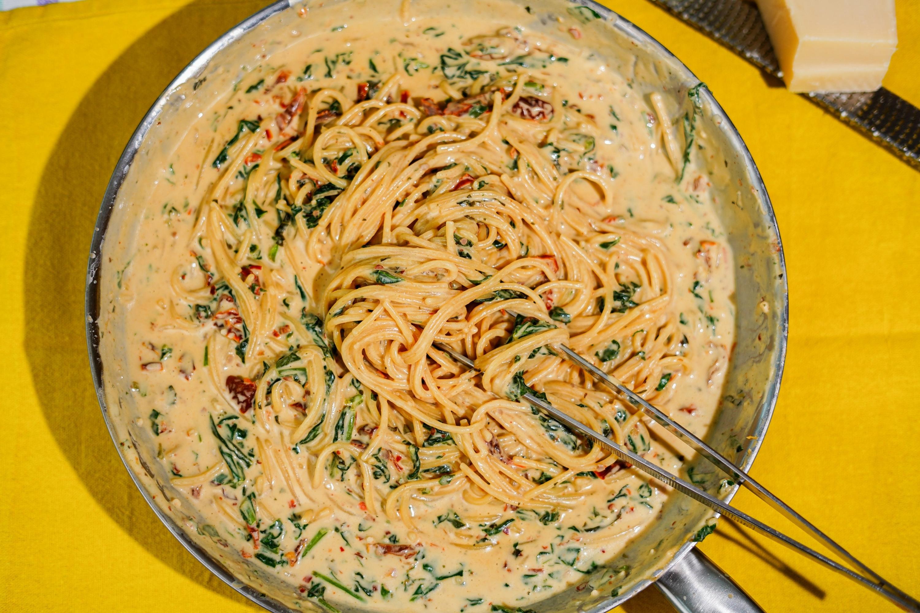 Pâtes en une seule casserole avec des tomates séchées au soleil, des épinards et du fromage à la crème