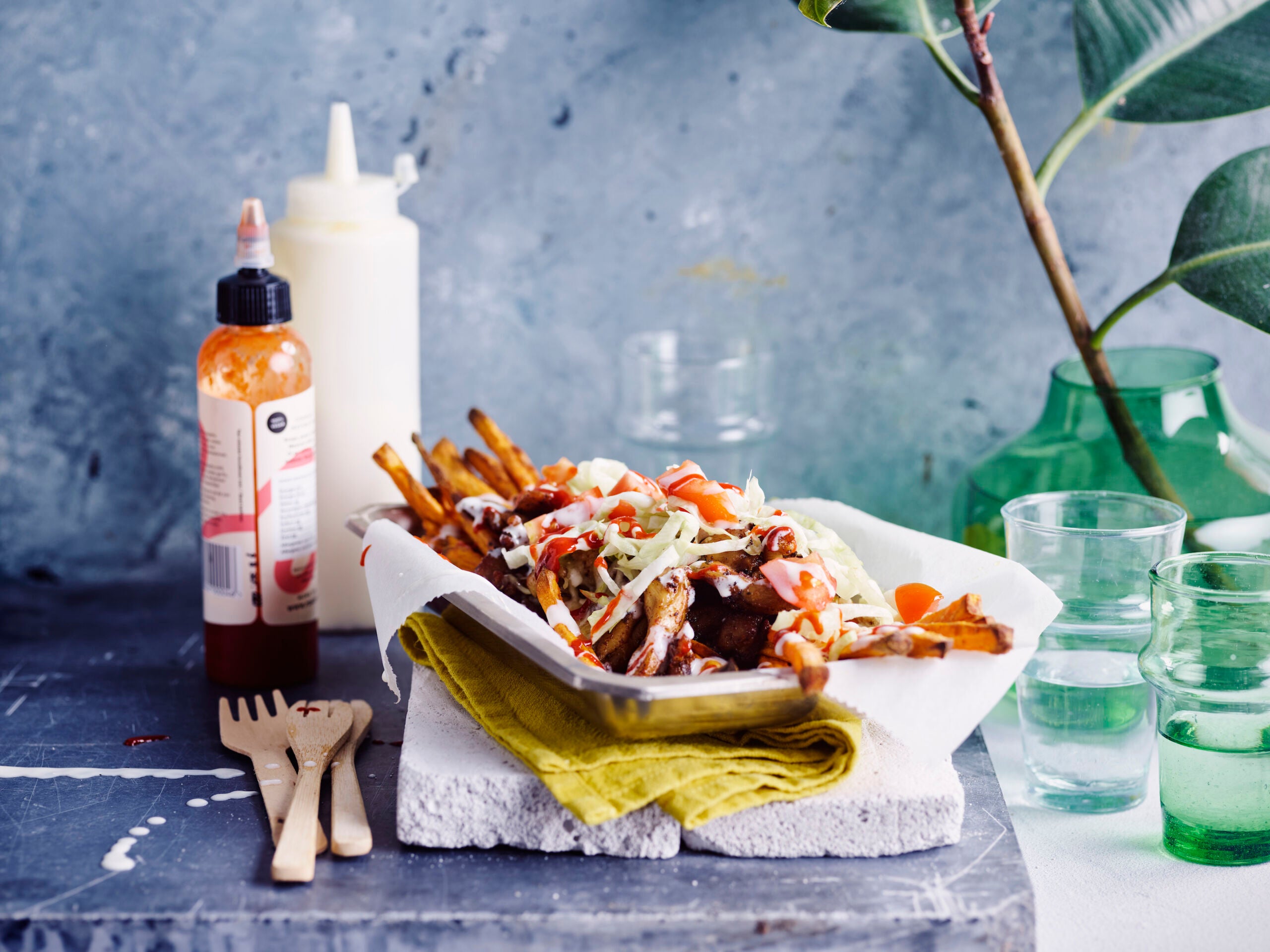 Poulet 'kapsalon' avec patate douce et yaourt