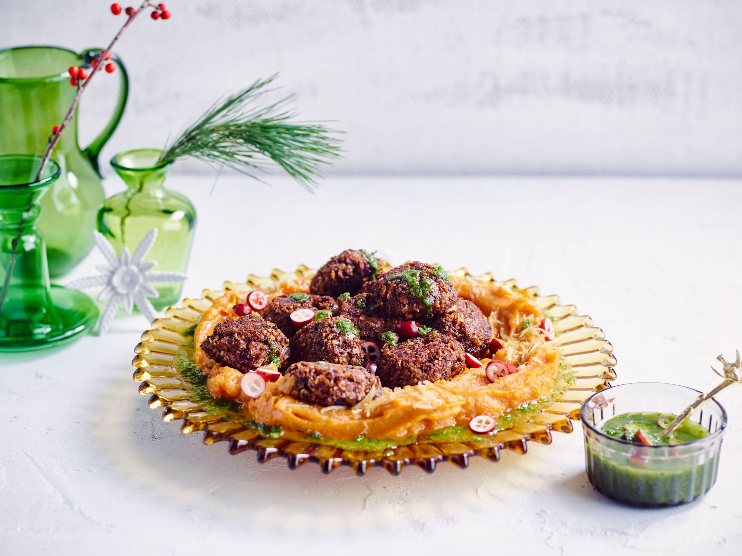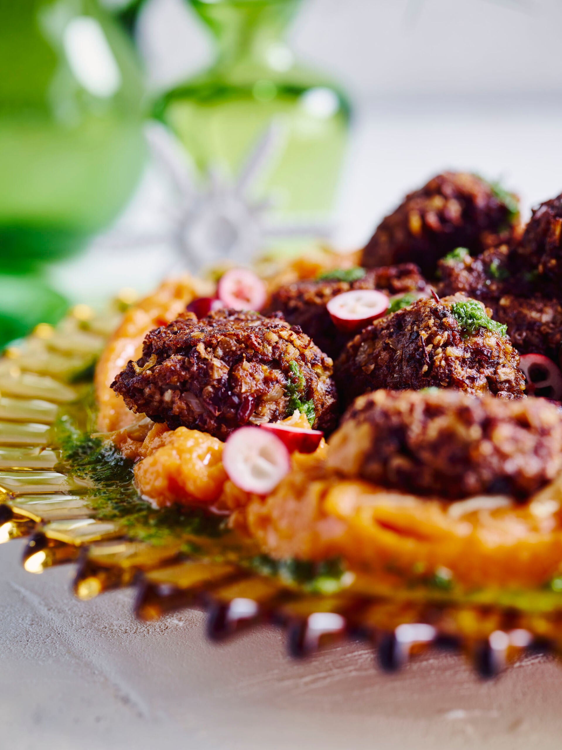 Boulettes de viande véganes sur purée de patate douce et vinaigrette à la ciboulette