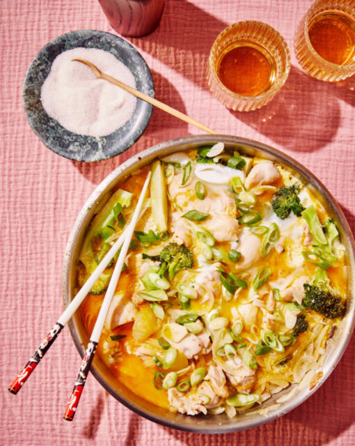 Servir avec du riz basmati cuit à la vapeur pour un repas complet. Ajoutez une cuillère de sriracha pour des épices supplémentaires. Vous préférez végétarien? Remplacez le poulet par du tofu et utilisez du bouillon de légumes.