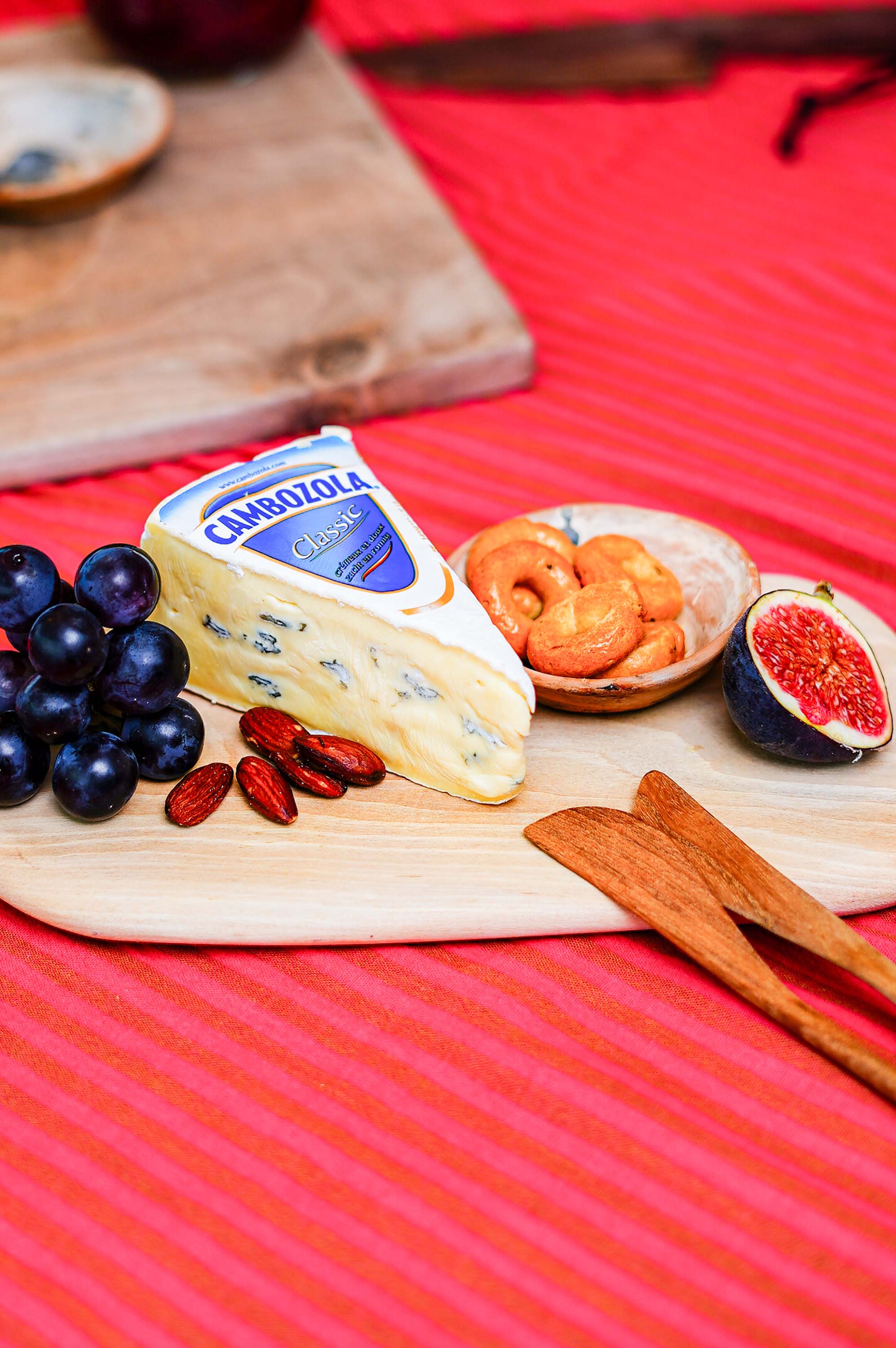 Complétez votre plateau avec des noix, des olives, des raisins, des crackers et des cornichons accompagnés de jambon.