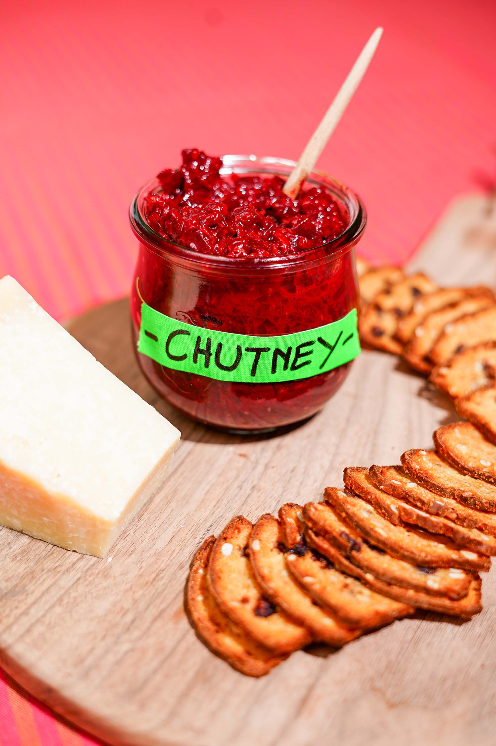 Disposez les croquettes de cambozola par-dessus et parsemez de persil et de ciboulette. Servez avec un petit bol de chutney de betterave.