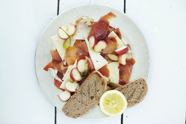 Plateau de tapas avec jambon ibérique, Manchego et pêche