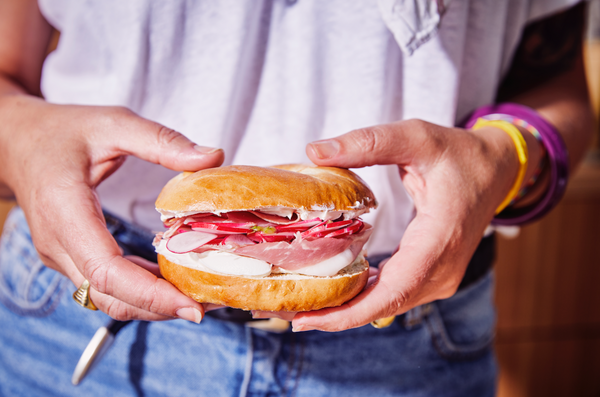 Bagel avec fromage à la crème, pesto, radis et jambon de Ganda