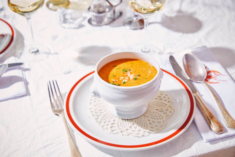 Servez la bisque dans des assiettes et terminez avec des morceaux de homard et du persil finement haché.