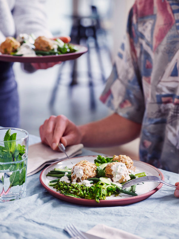 Boulettes cuites à la vapeur avec des haricots, broccolini et sauce yaourt-menthe