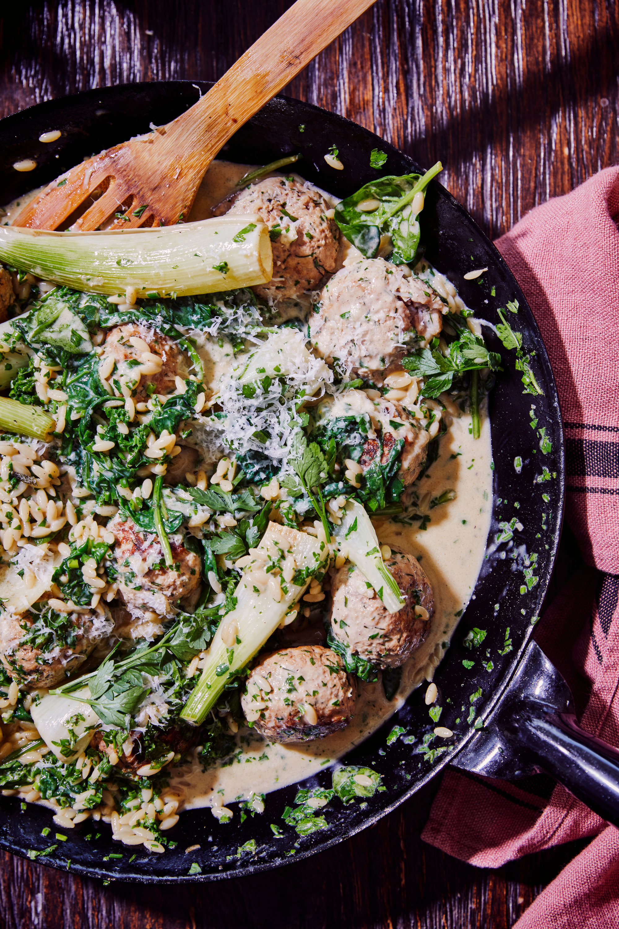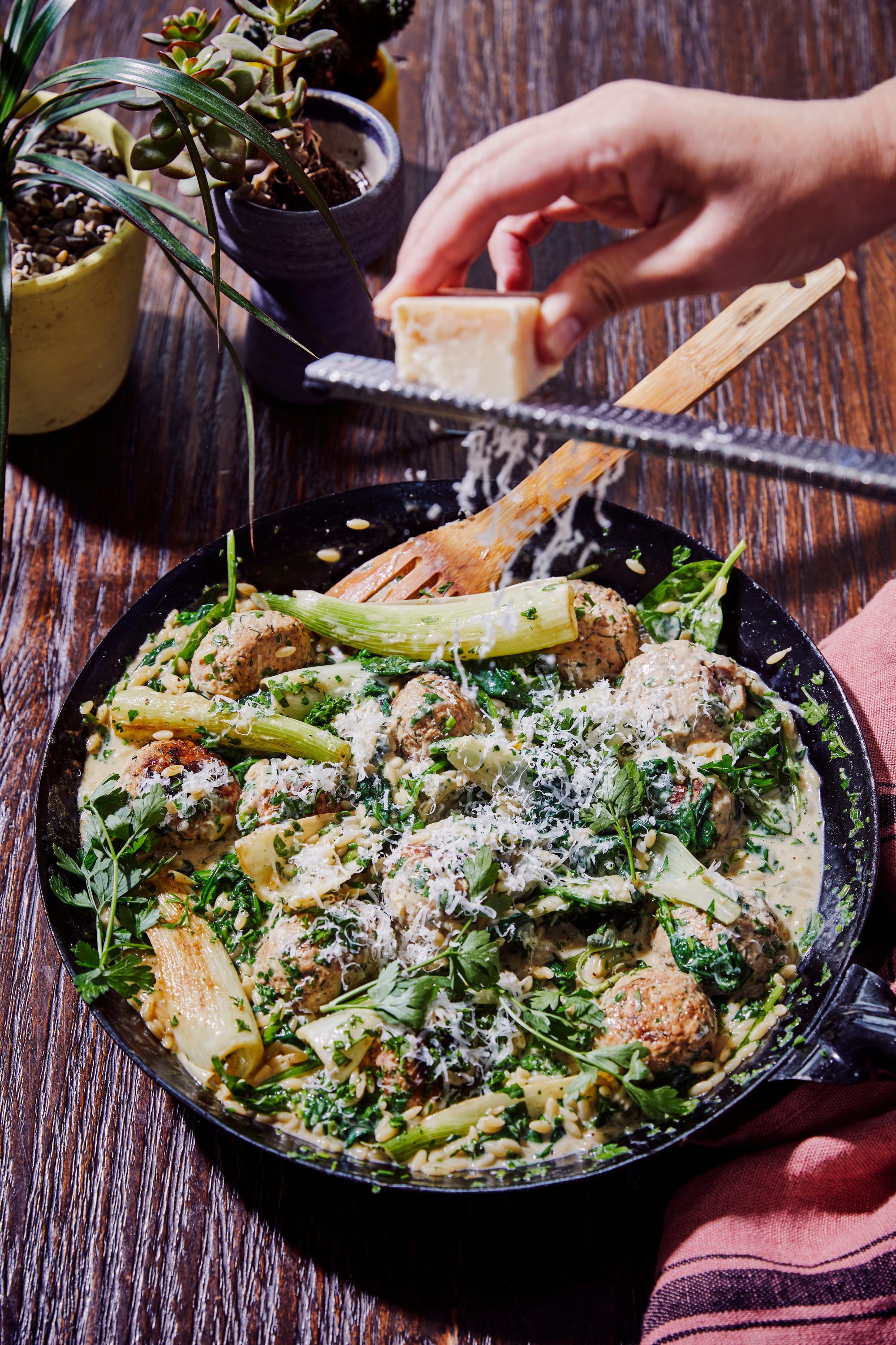 Boulettes avec fenouil, épinards, orzo et parmesan