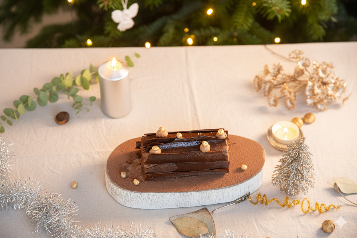Sortez le chocolat roulé du réfrigérateur, ouvrez-le et remplissez la bûche de Noël tout autour. Déroulez entièrement le chocolat roulé et raidi et collez les pépites de chocolat tout autour de la bûche de Noël. Laisser prendre au réfrigérateur pendant au moins 4 heures. Vous pouvez maintenant portionner les souches avec un couteau bien aiguisé et de l'eau bouillante. Collez les noix avec du miel ou du chocolat.