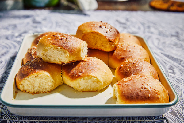 Saupoudrez votre plan de travail avec un peu de farine. Placez la pâte dessus et formez une boule plate. Divisez en quatre, puis chaque morceau en 3 morceaux égaux afin d'obtenir 12 morceaux de taille égale. Façonnez-les tous joliment, aplatissez-les un peu et placez-les sur une plaque de cuisson rectangulaire graissée. Ces petits pains vont bien se toucher. Vous pouvez aussi les espacer sur une plus grande plaque de cuisson si vous préférez qu'ils soient complètement ronds.