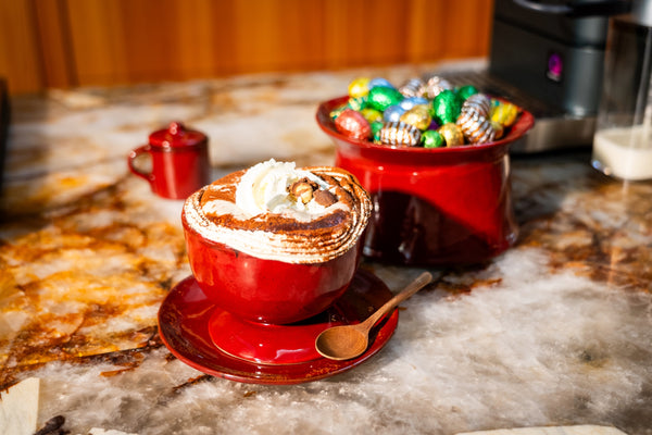 Finition : Terminez avec de la crème chantilly, une pincée de cacao en poudre et des œufs de Pâques supplémentaires.