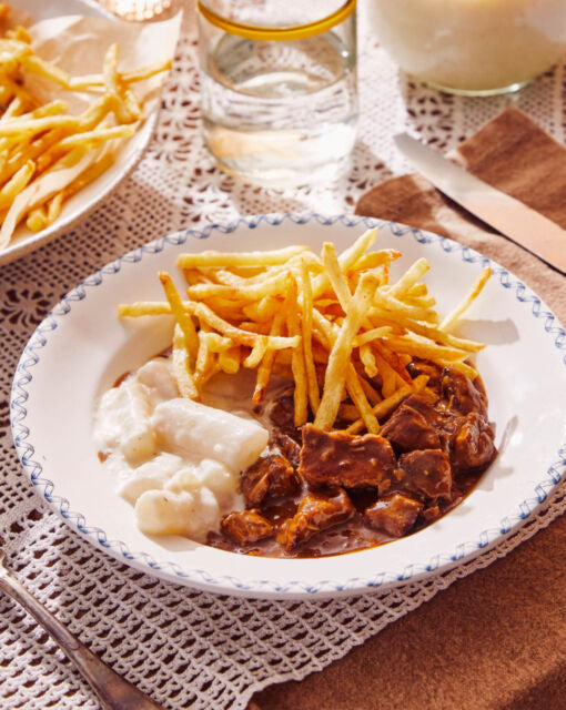 Boeuf mijoté à la bière brune avec pain d'épices et moutarde, frites fraîches et salsifis en sauce béchamel