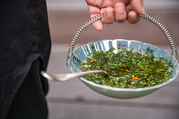Qu'est-ce dont tu as besoin?1 échalote<br>1 poivron rouge<br>1/2 piment rouge, sans graines<br>1 gousse d'ail<br>0,5 botte de persil<br>0,5 botte de persil plat<br>Une poignée d'origan frais<br>Une poignée de basilic<br>3 cuil. à soupe de vinaigre de vin rouge<br>10 cl d'huile d'olive<br>Fleur de sel