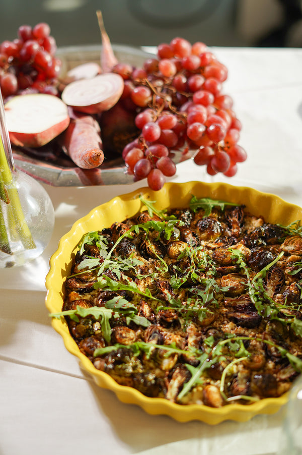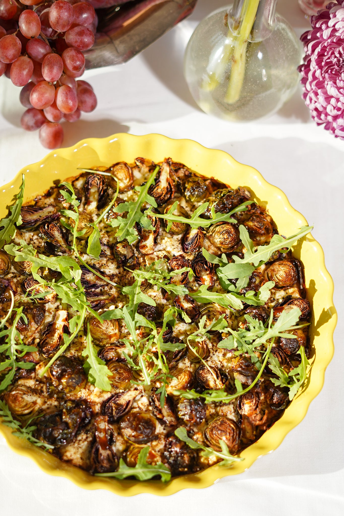 Disposez les moitiés de choux de Bruxelles, face coupée vers le bas, parmi la feta. Appuyez légèrement pour bien les intégrer.
