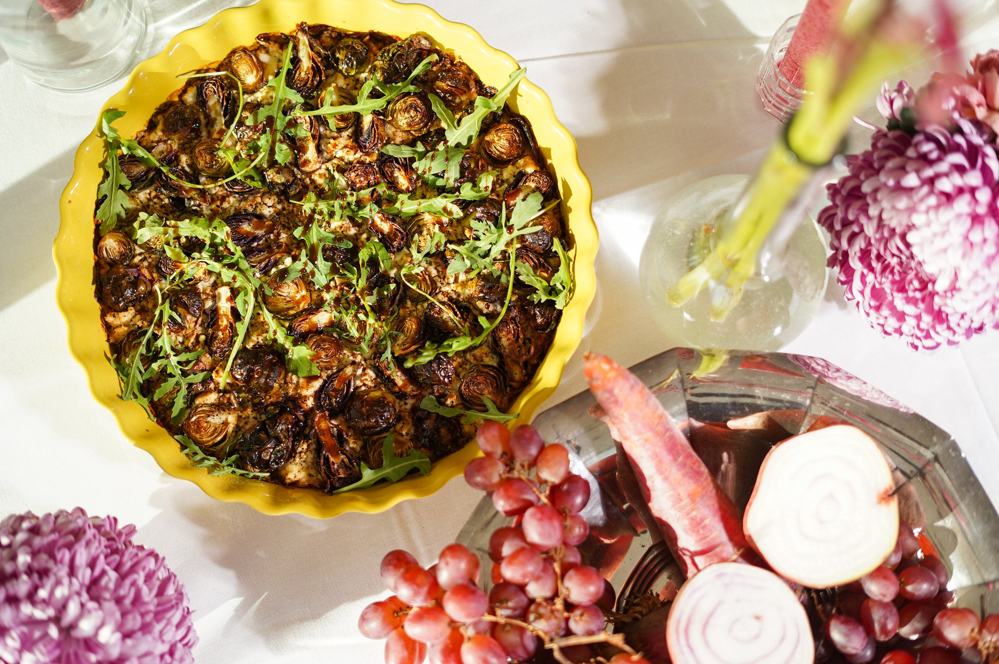 Arrosez le tout d'huile d'olive et assaisonnez de sel et de poivre. Enfournez pendant 25 minutes, ou jusqu'à ce que les choux de Bruxelles soient bien dorés et cuits à cœur et que la feta commence à fondre et à dorer légèrement.