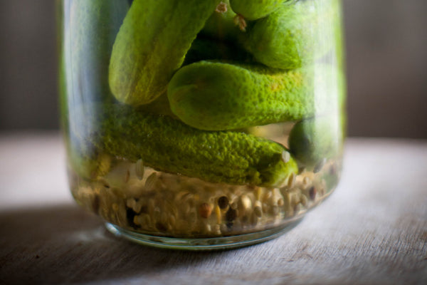 Mettez les cornichons dans un pot de conserve avec deux cuillères à soupe de sel, le sucre, les graines de moutarde et les grains de poivre blanc.