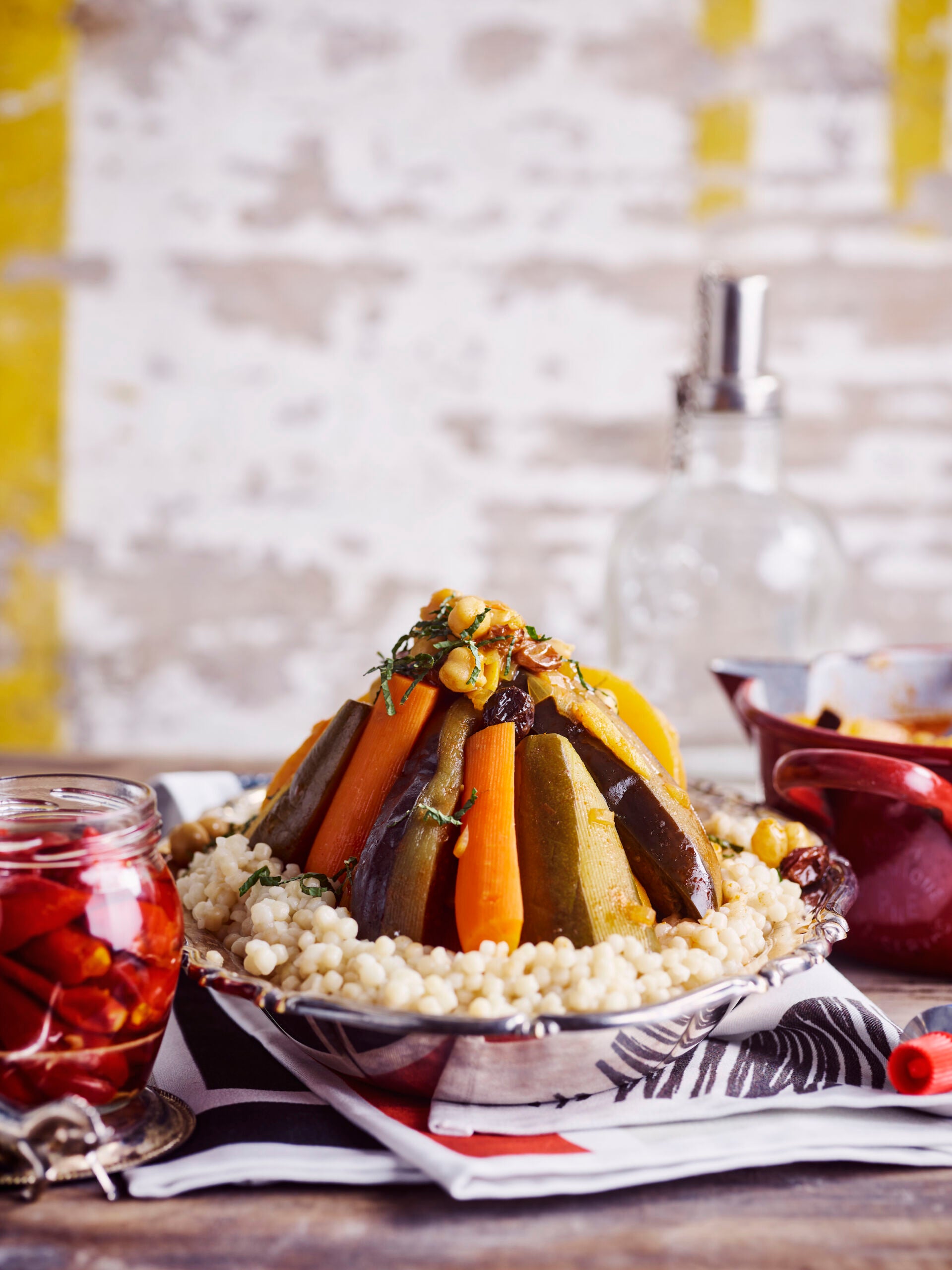 S'il n'y a rien sur l'emballage, mettez dans un bol 1 part de semoule et 2 parts d'eau, couvrez avec une assiette et laissez reposer pendant environ 5 minutes. Émiettez avec une fourchette. Mettez la semoule dans un grand plat, disposez tous les légumes en cercle et au centre les pois chiches et les raisins secs, gardez le bouillon à part pour servir à table.