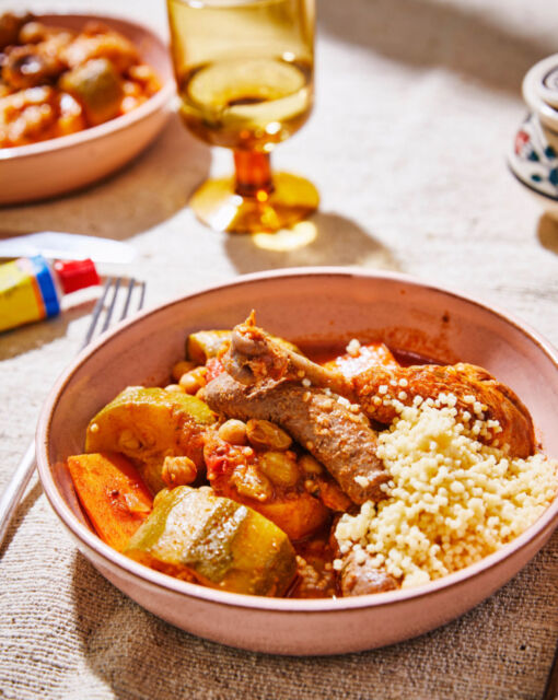 Servir : Égrenez le couscous avec une fourchette et servez avec le poulet, les merguez, les légumes et le délicieux bouillon. Servez éventuellement avec un peu de harissa pour une touche épicée supplémentaire.