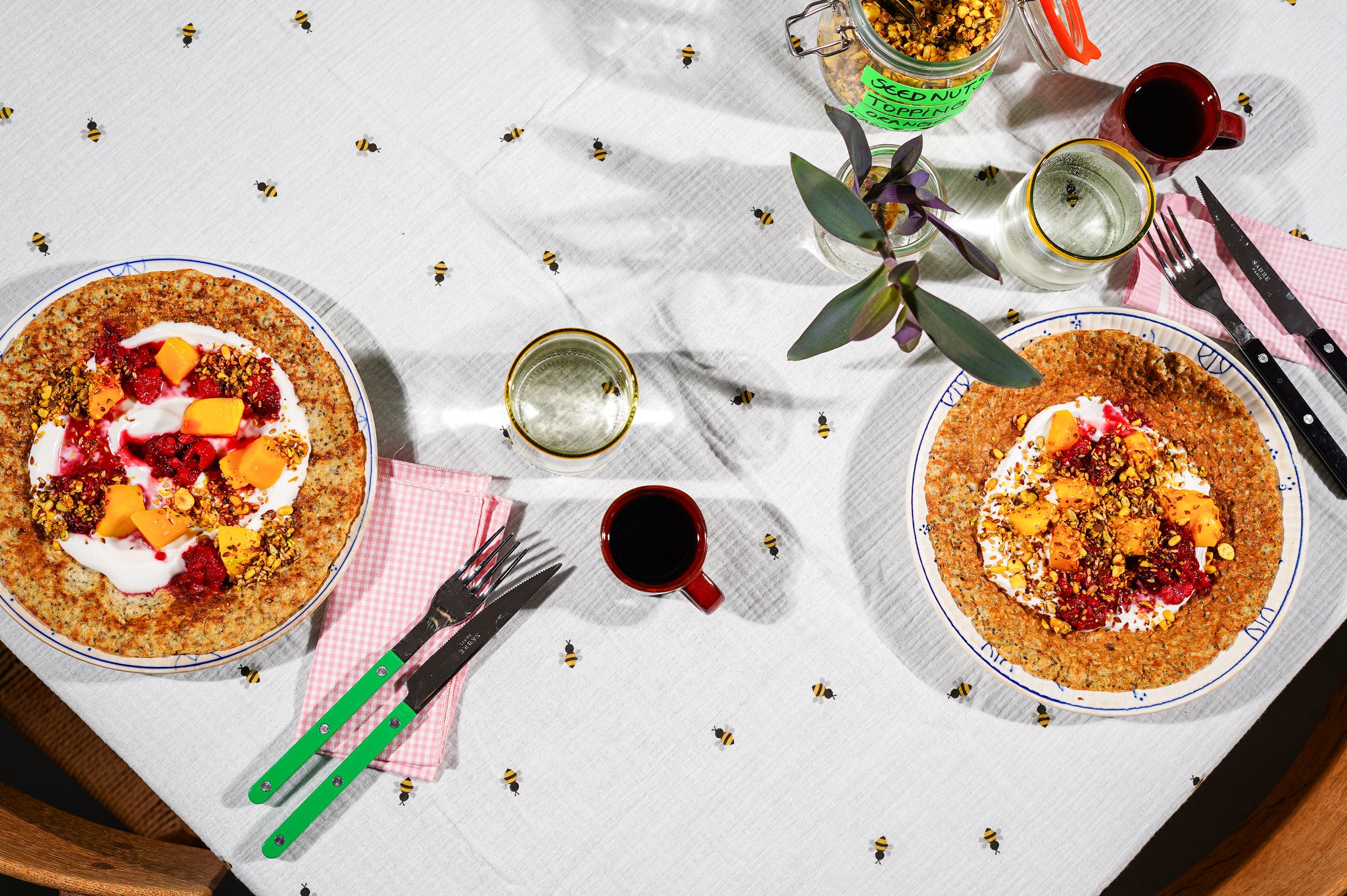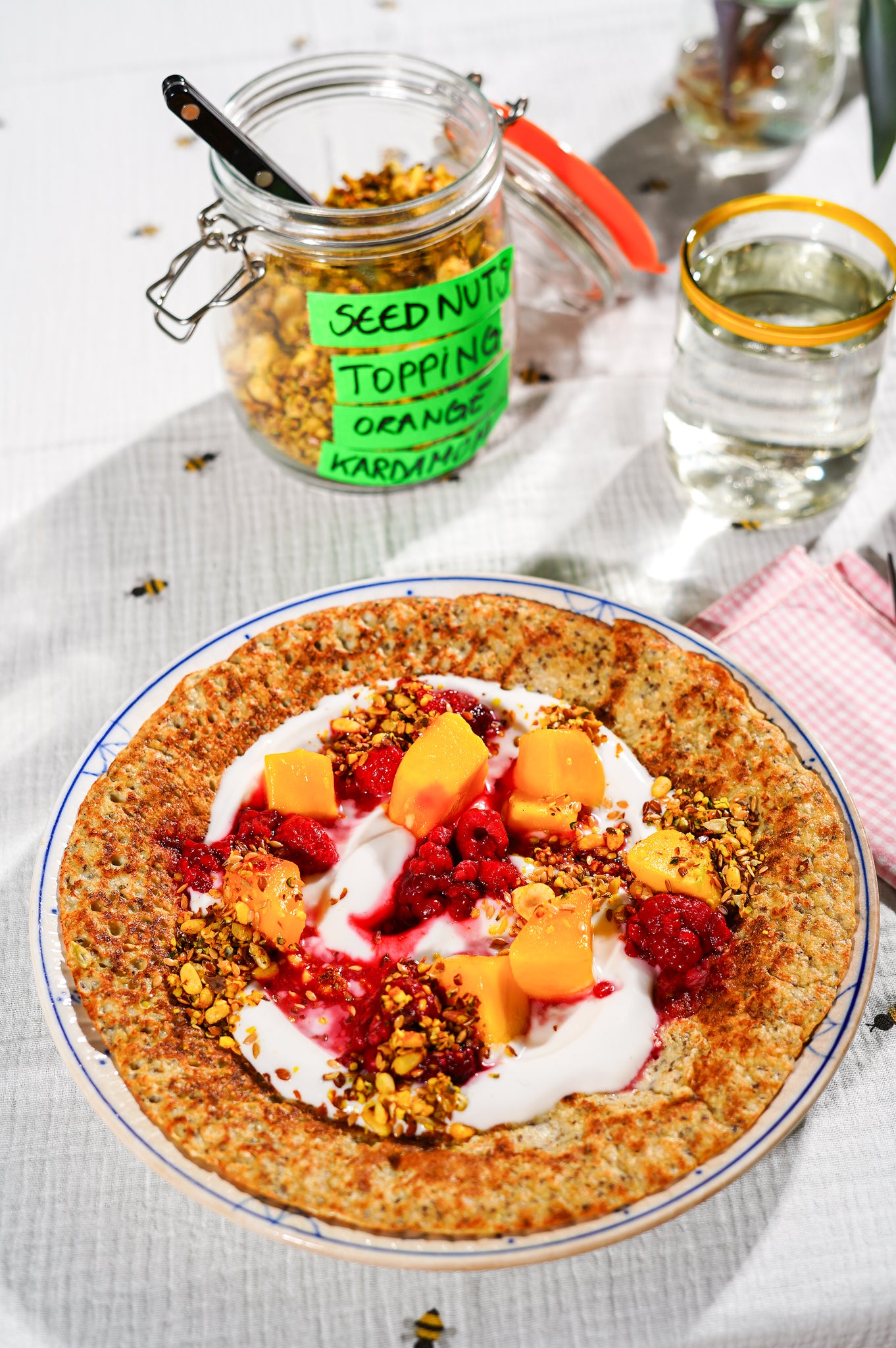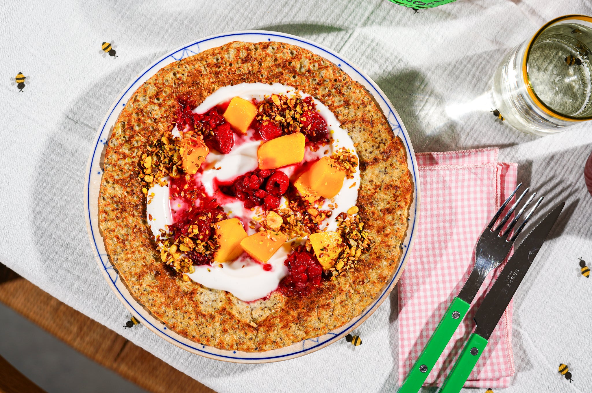 Pour servir : Servir les crêpes avec une généreuse cuillerée de yaourt à la noix de coco, un peu de mangue et de framboises, et terminer par une cuillerée de mélange de noix et graines à l'orange et à la cardamome.