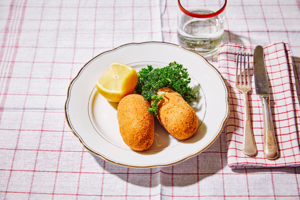 Disposez les croquettes sur les assiettes, saupoudrez de persil et placez une demi-citron sur chaque assiette.