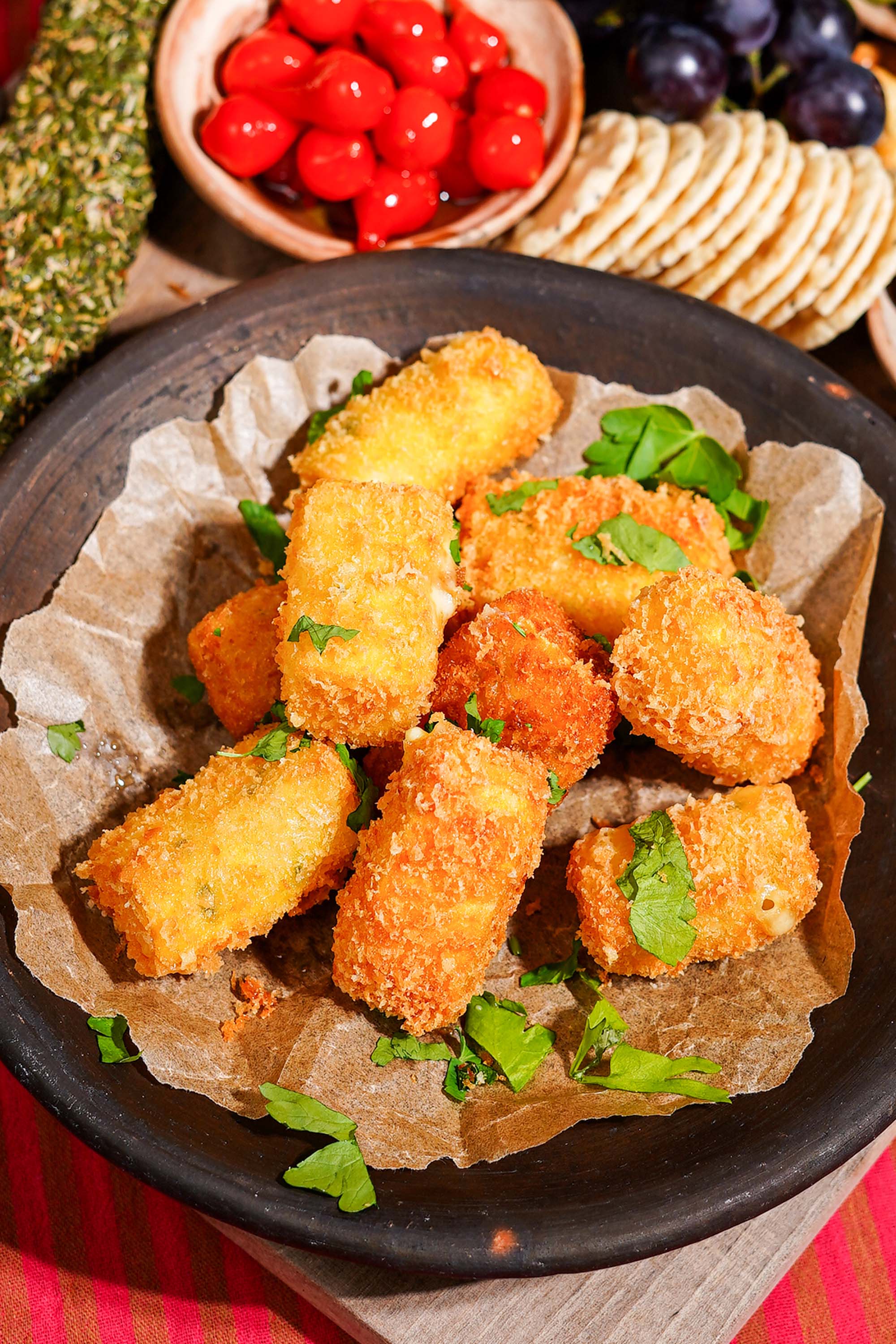 Bak de kroketjes: Verwarm een flinke laag (ongeveer 1 cm) neutrale olie in een brede pan op middelhoog vuur. Bak de kroketjes ongeveer 3 minuten in totaal: na 1,5 minuut omdraaien, tot ze mooi goudbruin zijn.