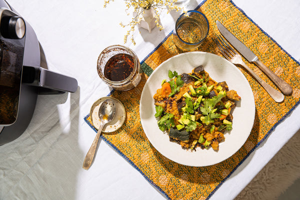 Curry de légumes avec aubergine et lentilles dans la friteuse à air