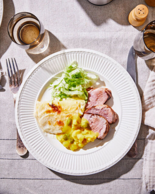 Service : Servez les tranches de filet de porc avec la sauce Blackwell, le gratin dauphinois et une salade fraîche.