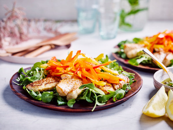 Filets de rouget avec poivrons, salade et huile aux herbes