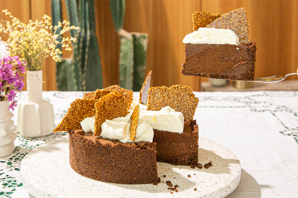 Démoulez le gâteau, retirez le film plastique, placez-le sur une assiette et déposez la crème fouettée dessus, faites des tourbillons et ouvrez un peu, cassez le croustillant au sésame en gros morceaux et enfoncez-les dans la crème fouettée. Coupez le gâteau avec un couteau chaud que vous trempez à chaque fois dans de l'eau chaude.