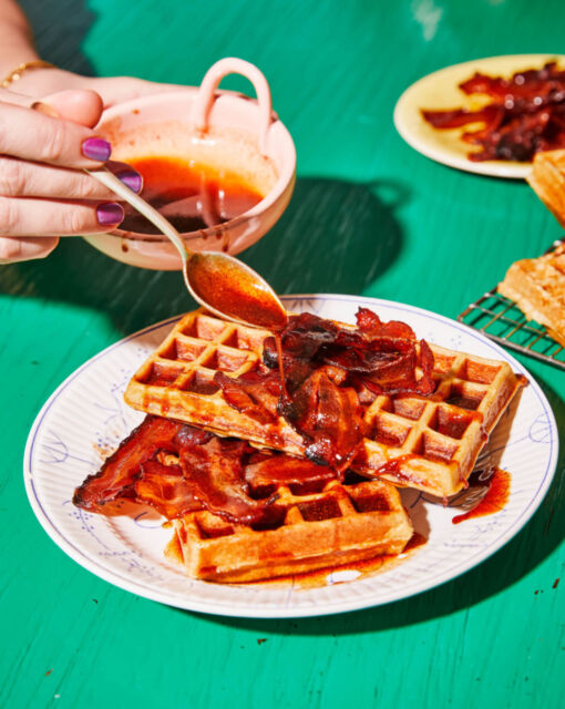 Gaufres avec du bacon glacé au miel et au paprika fumé