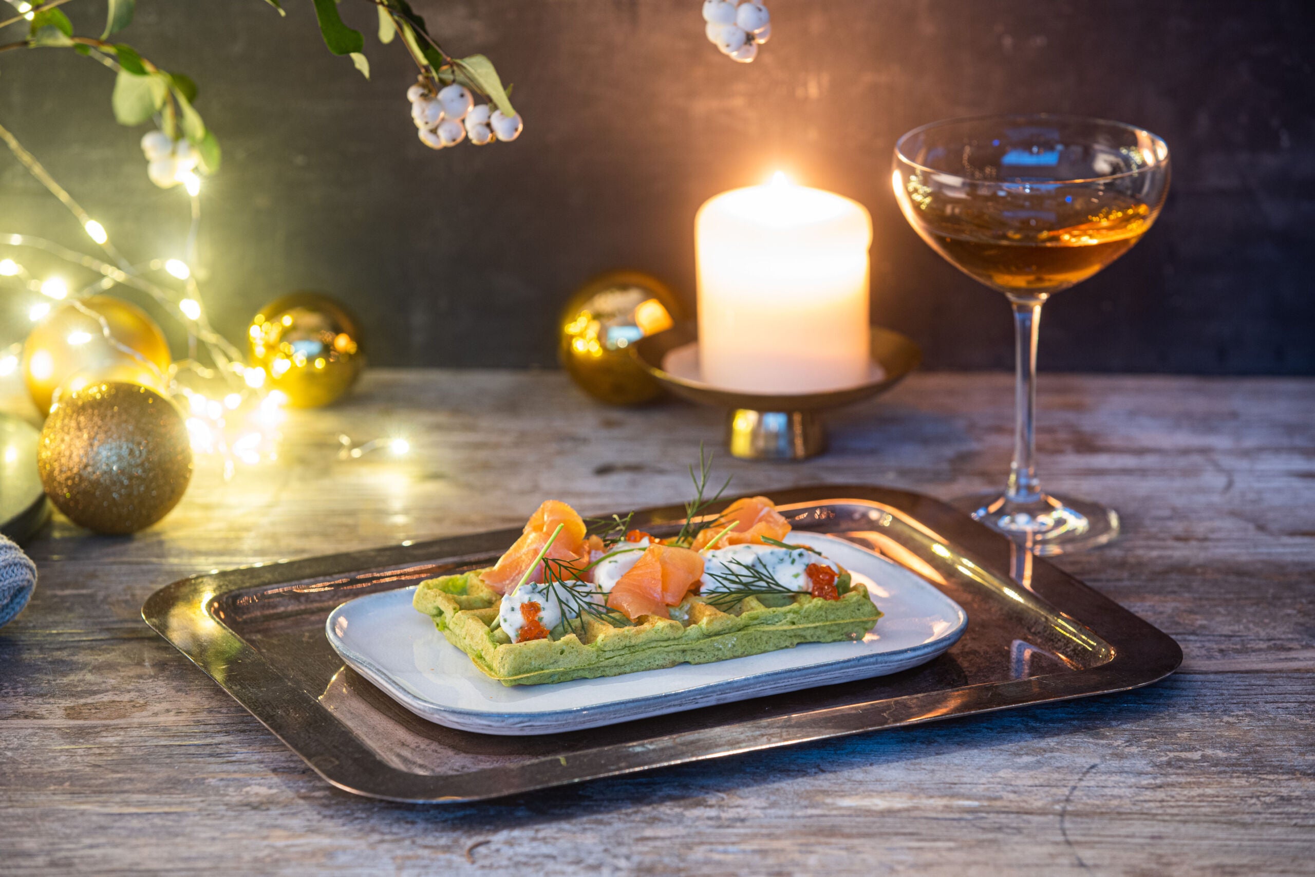 Au moment de servir, réchauffez les gaufres 2 min dans un four préchauffé à 200 °C. Disposez le saumon et les œufs de truite dessus, puis décorez avec la crème de ciboulette juste avant de servir. Décorez avec de l'aneth et de la ciboulette. Servez immédiatement.