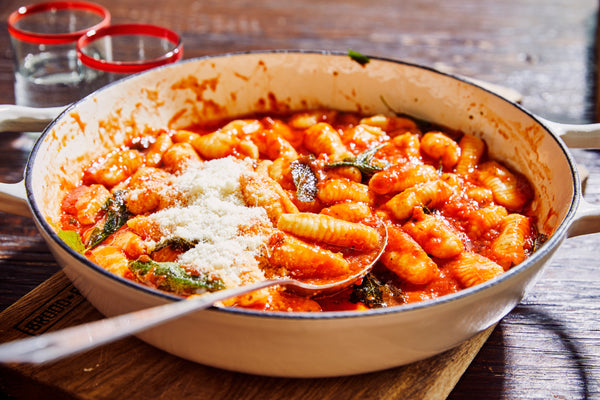 Chauffez un peu d'huile dans un grand bol, ajoutez la sauge et déglacez avec la sauce tomate. Une fois que ça bout, ajoutez-y les gnocchis, mélangez et terminez avec du fromage. J'aime y ajouter un peu de roquette épicée ! 😉 Essayez aussi avec du beurre et de la sauge frite ou avec du basilic.