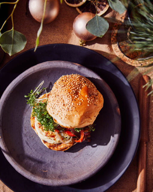 Burgers de dinde avec guanciale, mayonnaise au poivre et légumes provençaux grillés