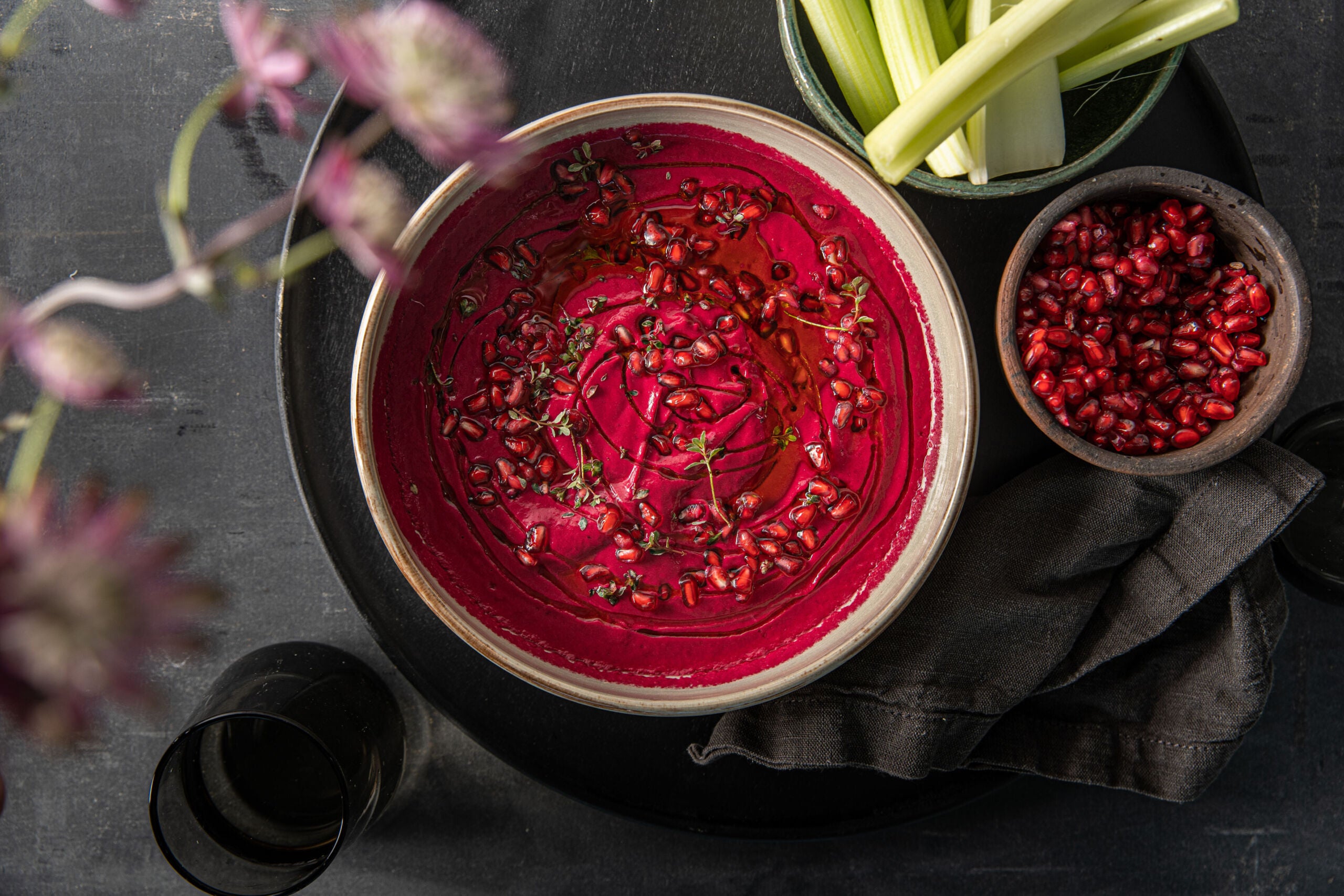 Versez dans une assiette creuse, parsemez de graines de grenade et terminez généreusement avec votre meilleure huile d'olive et du thym citron.