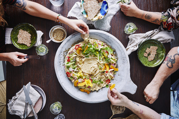 Hummus avec des crackers de fenouil-sésame et de l'huile aux herbes