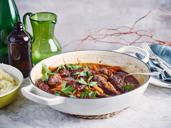 Joues de porc avec de la bière brune et de la purée de pommes de terre