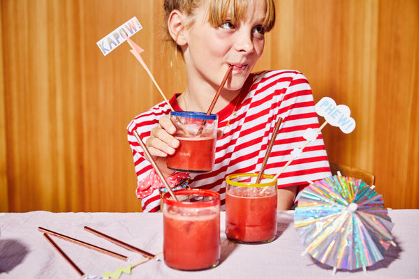 Remplissez 4 verres de glaçons et versez le jus dessus. Ajoutez des pailles pour une touche festive. Servez immédiatement.