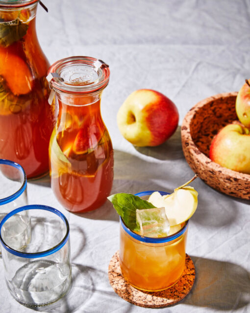 Servir le kombucha refroidi, sur la glace, avec une garniture de pomme fraîche et de basilic pour l'expérience de goût ultime.