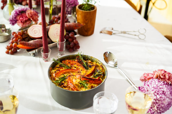 Terminez avec des brins de romarin entre les quartiers de courge. Servez la lasagne dans la poêle, directement à table.
