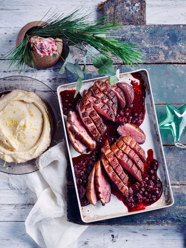 Retournez ensuite les poitrines de canard côté viande et faites cuire encore 2 minutes. Ensuite, placez-les sur du papier absorbant et laissez reposer 5 minutes avant de trancher. Gardez-les au chaud dans le four à 40°C.