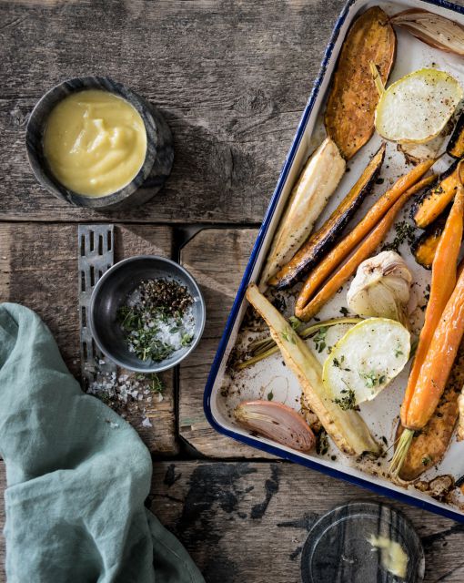 Utilisez les ingrédients comme vous utiliseriez la mayonnaise classique. Ici, je le sers avec des légumes grillés tièdes au four. Lavez les légumes, épluchez-les si nécessaire, arrosez de poivre, de sel marin, de thym, d'ail, d'échalote, mélangez bien, répartissez tout côte à côte sur une plaque de cuisson recouverte de papier sulfurisé, faites rôtir pendant 20 minutes à 190°C, c'est prêt !