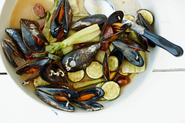 Préparation des moules : Rincez soigneusement les moules sous l'eau froide et retirez les exemplaires cassés ou ceux qui ne se ferment pas après un coup. Ajoutez les moules dans la poêle avec les légumes ainsi que les tomates cerises.