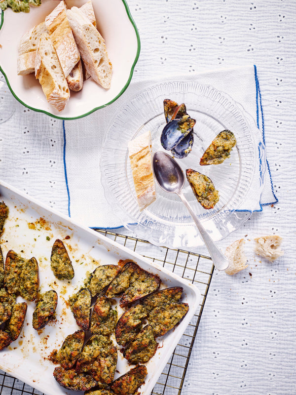 Mélangez tous les ingrédients pour le beurre et filtrez le jus de moules et de vin sur le beurre. Mélangez bien le tout. Étalez le beurre sur les coquilles avec les moules.