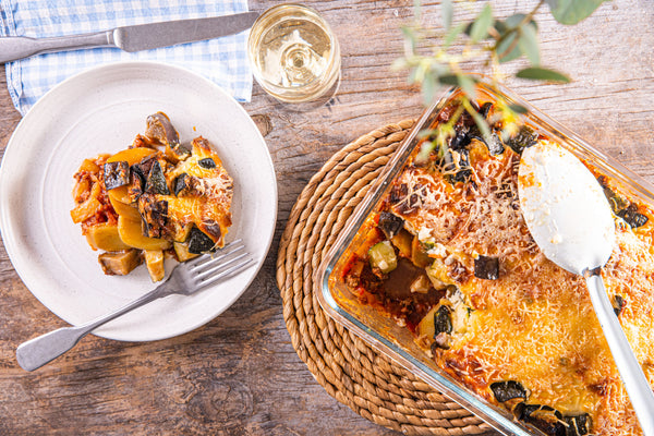 Faites des couches de légumes cuits, de sauce tomate, de pommes de terre et de sauce béchamel.