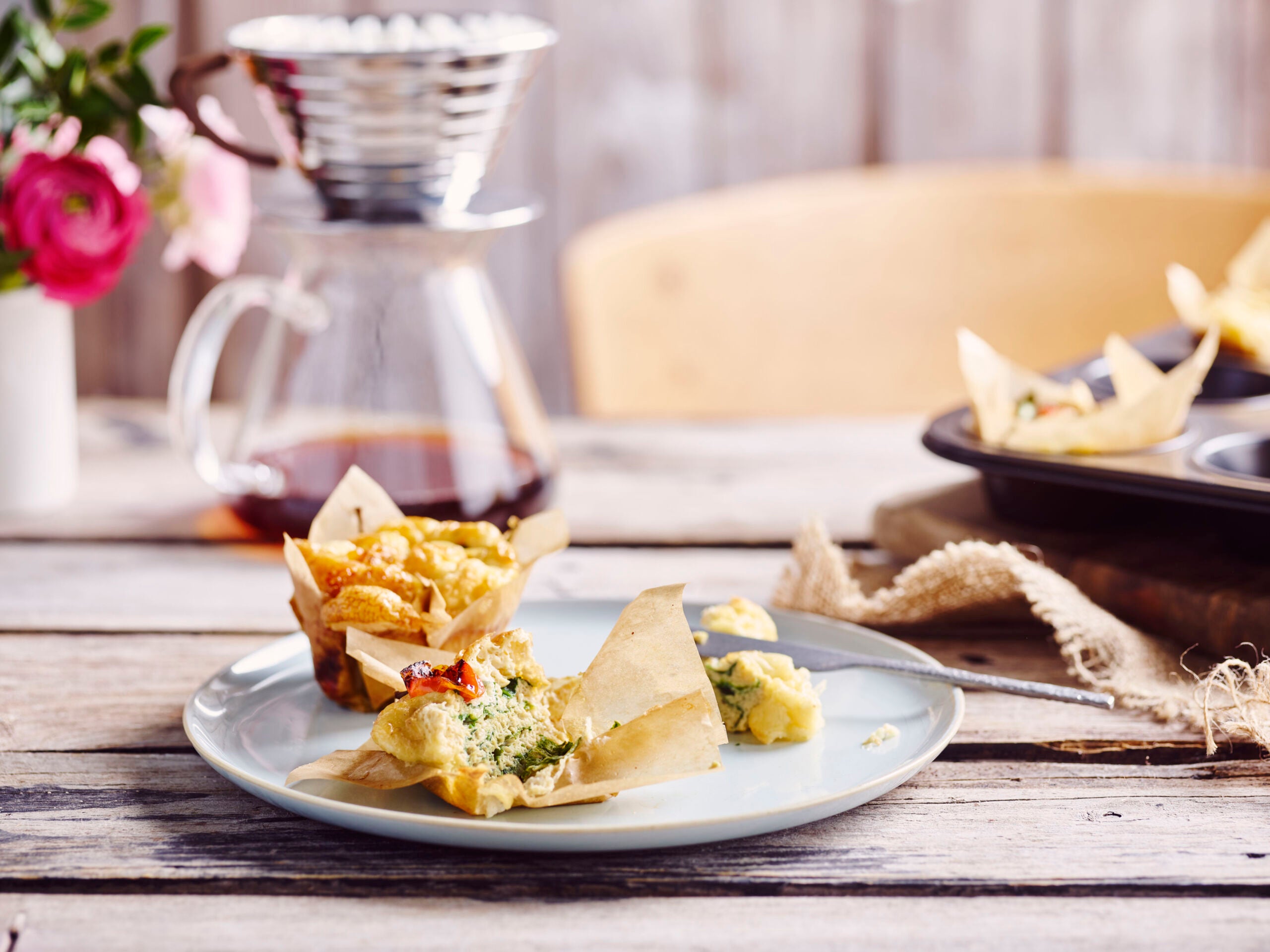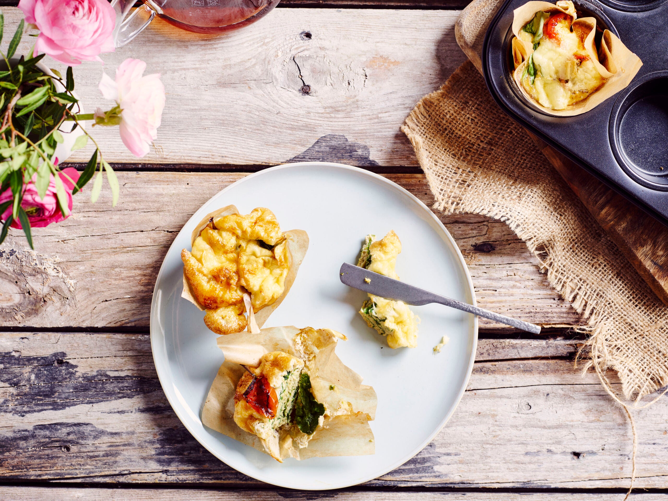 Répartissez les tomates, le basilic grossièrement haché, les épinards et le fromage en morceaux dans les moules.